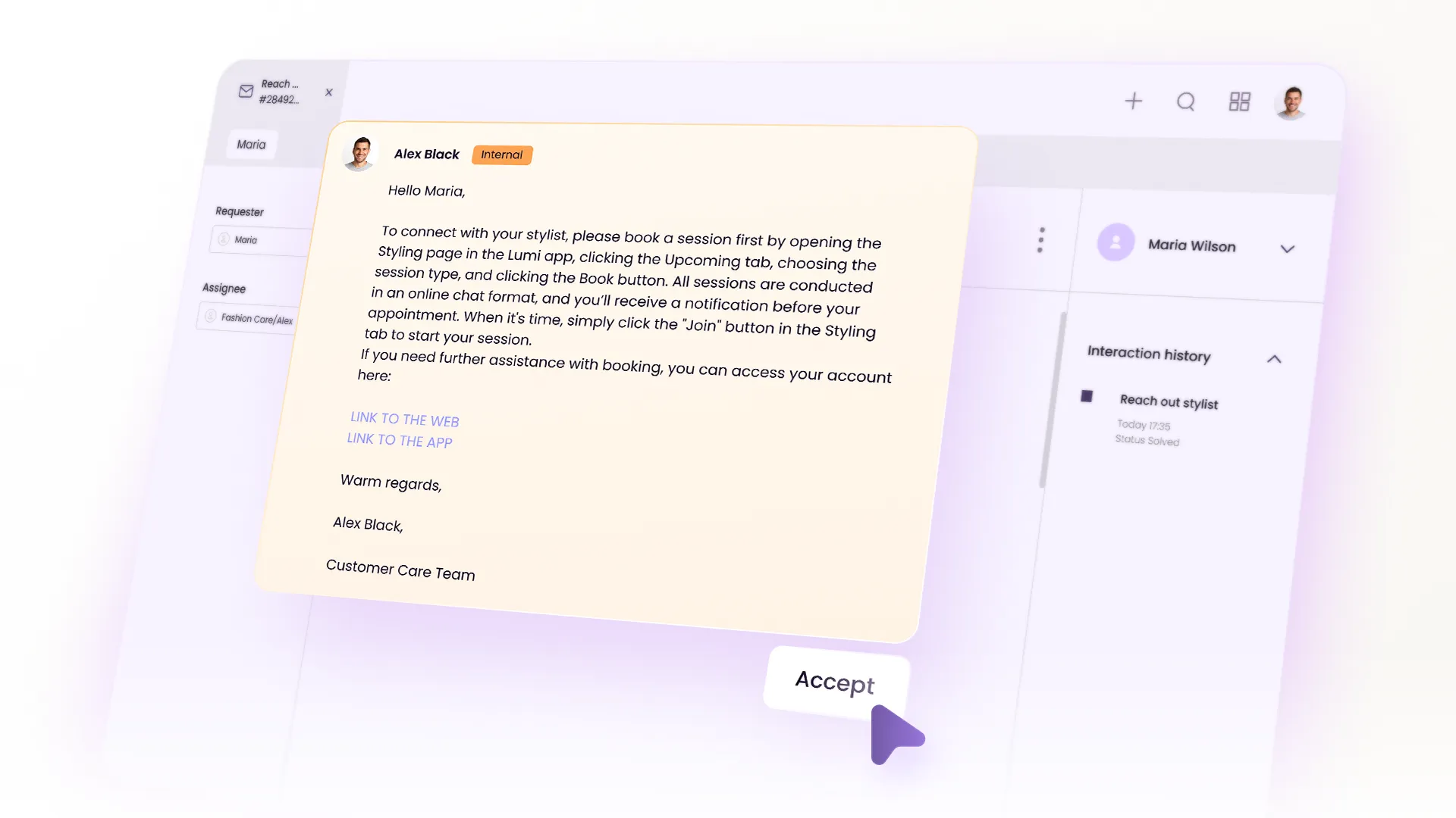Step 6. AI assists the agent (in hybrid mode): If a human steps in, AI provides drafts, summaries, and suggested next steps to speed up resolution.